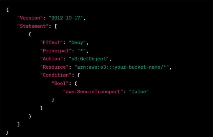 1. Define a resource-based policy on the S3 bucket to deny access when a request meets the condition"aws:SecureTransport": "false"-.