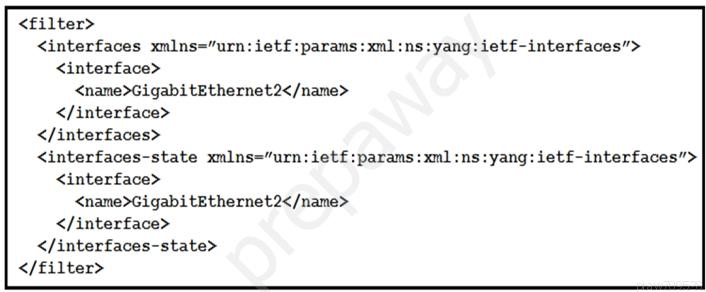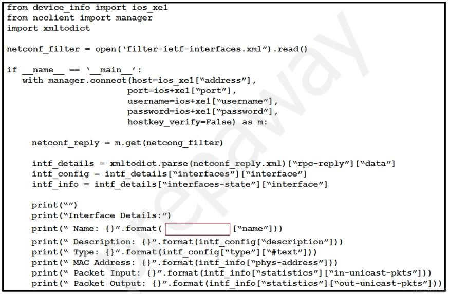Refer to the exhibits. An engineer creates a Python scripts using ncclient to display interface information. The code must be completed so that it can be tested.