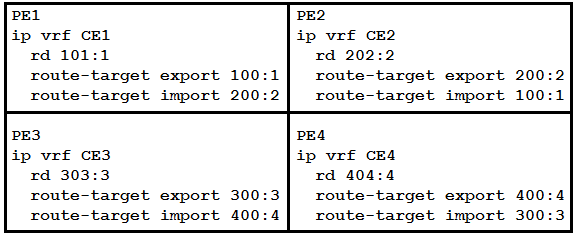 5. Configure PE1 to import route-targets 300:3 and 400:4.