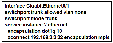 2. interface GigabitEthernet 0/10.10 encapsulation dot1q 10 rewrite ingress tag pop 1 symmetric l2vpn xconnect group 103588 p2p 103588 interface GigabitEthernet 0/10.10 neighbor ipv4 10.10.10.2 pw-id 103588
