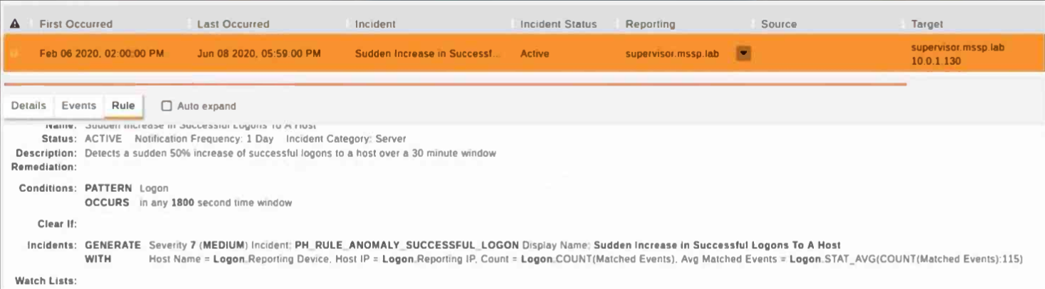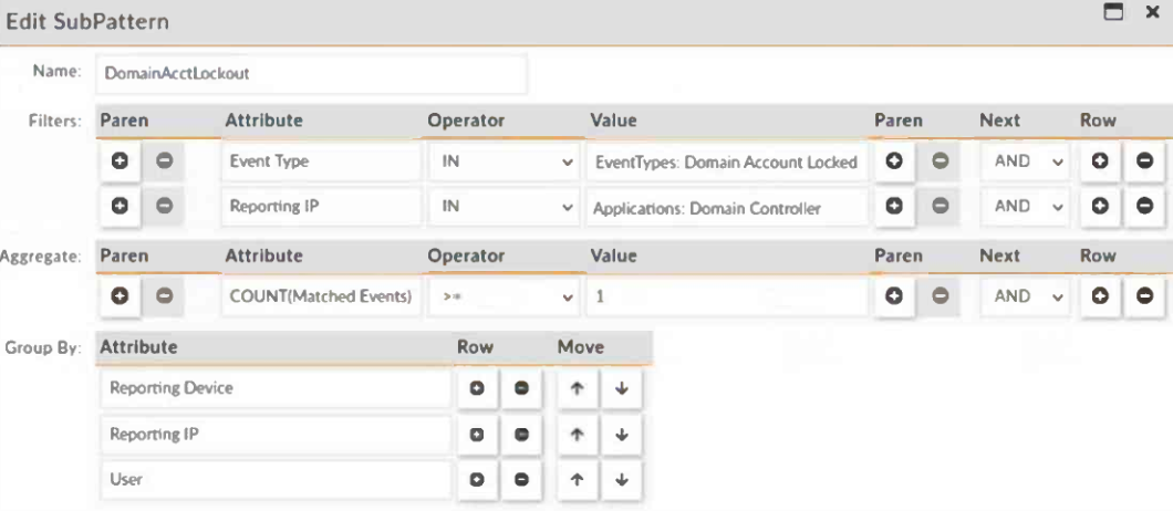 Consider the five account locked events received by FortiSIEM from domain controllers within the last 10 minutes (ten minutes is the evaluation window for the subpattern DomainAcctLockout):