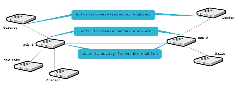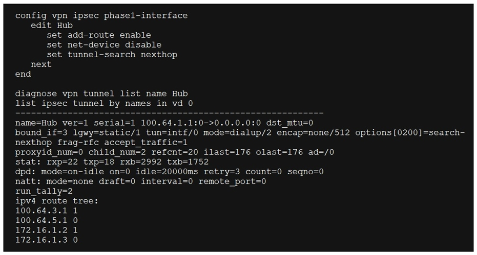 Multiple IPsec VPNs are formed between two hub-and-spokes groups, and site-to-site between Hub 1 and Hub 2. The administrator configured ADVPN on the dual regions topology.