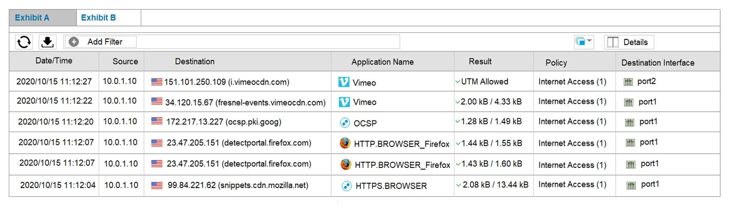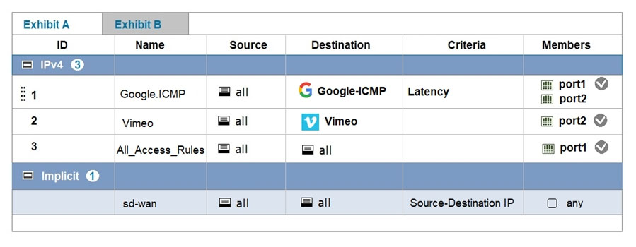 Exhibit A shows the SD-WAN rules and exhibit B shows the traffic logs. The SD-WAN traffic logs reflect how FortiGate processed traffic.