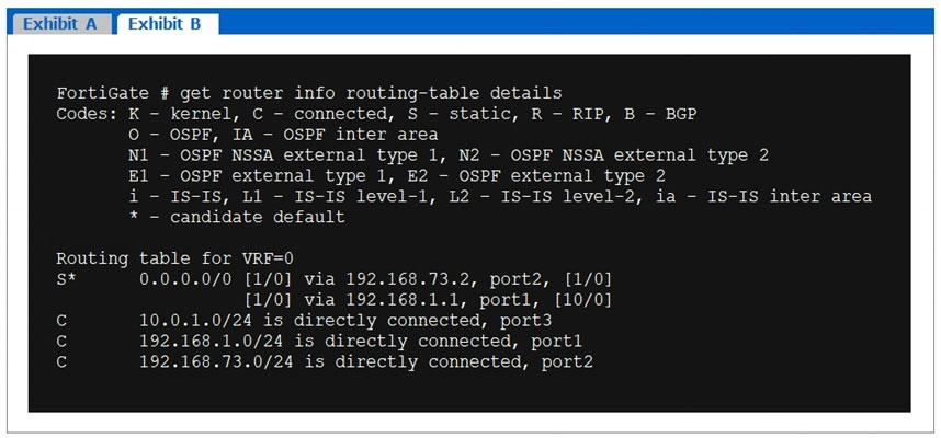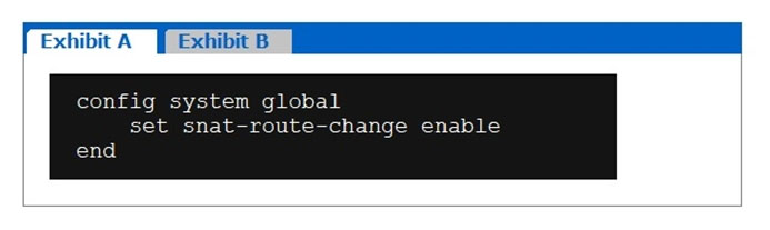 Exhibit A shows the source NAT global setting and exhibit B shows the routing table on FortiGate.