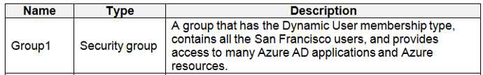 https://docs.microsoft.com/en-us/azure/active-directory/users-groups-roles/groups-dynamicmembershipScenario:Litware identifies the following identity and access requirements: All San Francisco users and their devices must be members of Group1.The tenant currently contain this group: Reference:https://docs.microsoft.com/en-us/azure/active-directory/users-groups-roles/groups-dynamicmembershiphttps://docs.microsoft.com/en-us/azure/active-directory/fundamentals/active-directory-groupscreate-azure-portal