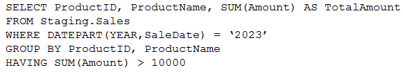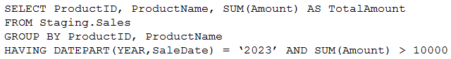 You need to write a T-SQL query that will return data for the year 2023 that displays ProductID and ProductName and has a summarized Amount that is higher than 10,000.