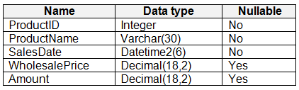 You have a Fabric warehouse that contains a table named Staging.Sales. Staging.Sales contains the following columns.