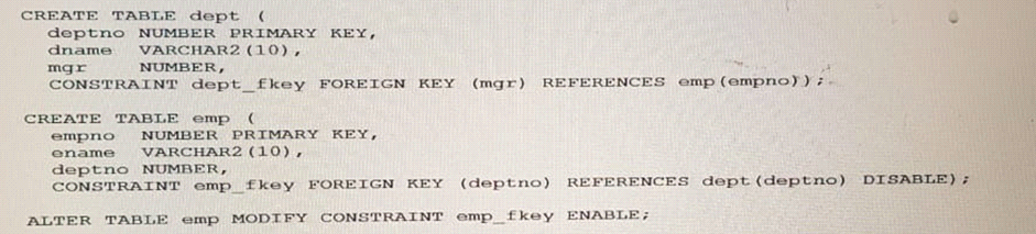4. The DEPT_FKEY constraint definition must be removed from the CREATE TABLE DEPT statement. and the added with an D. ALTER statement once both tables are created, for the two CREATE TABLE statements to execute successfully in the order shown.